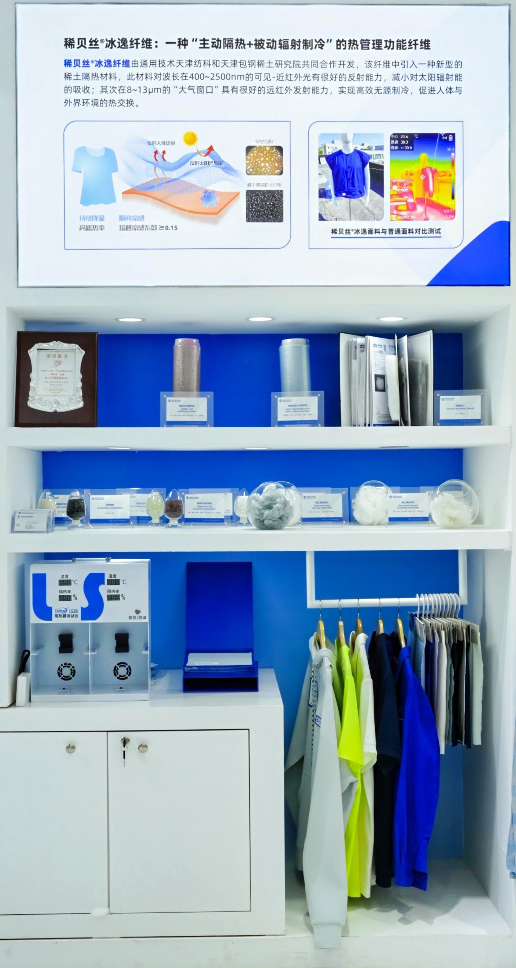 通用技术新材中纺院天津纺科与天津包钢稀土研究院联合研发的稀贝丝®冰逸纤维引入新型稀土隔热材料,对波长在400~2500mmn的可见-近红外光有很好的反射能力,在8~13μm“大气窗口”具有很好的远红外发射能力,实现高效无源制冷促进人体与外界环境的热交换。