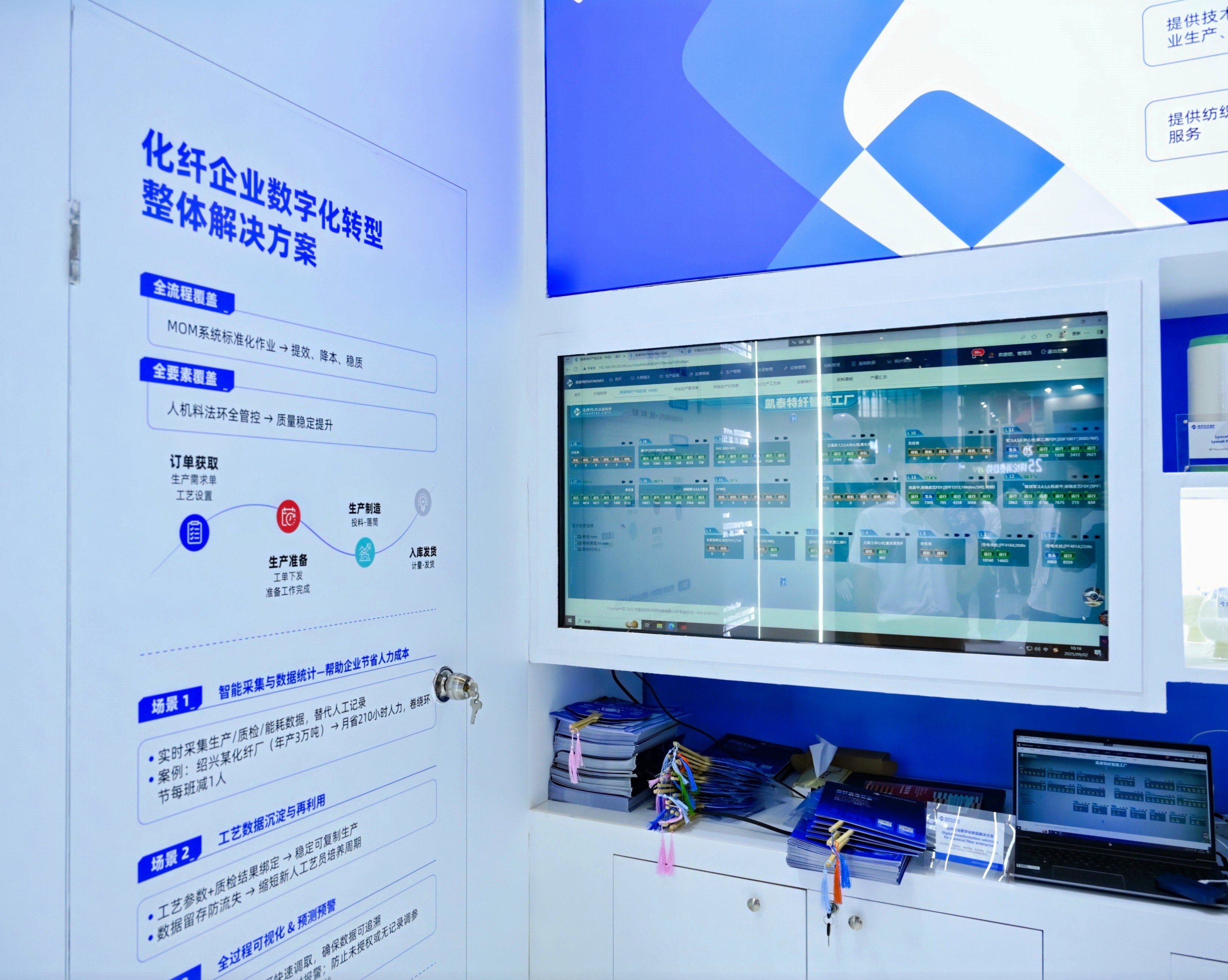 “化纤企业数字化转型整体解决方案”以产品质量为核心,贯穿采集层-数据层-业务层全链路,实现生产过程透明化、产品质量管控精准化和成本收益精确化。