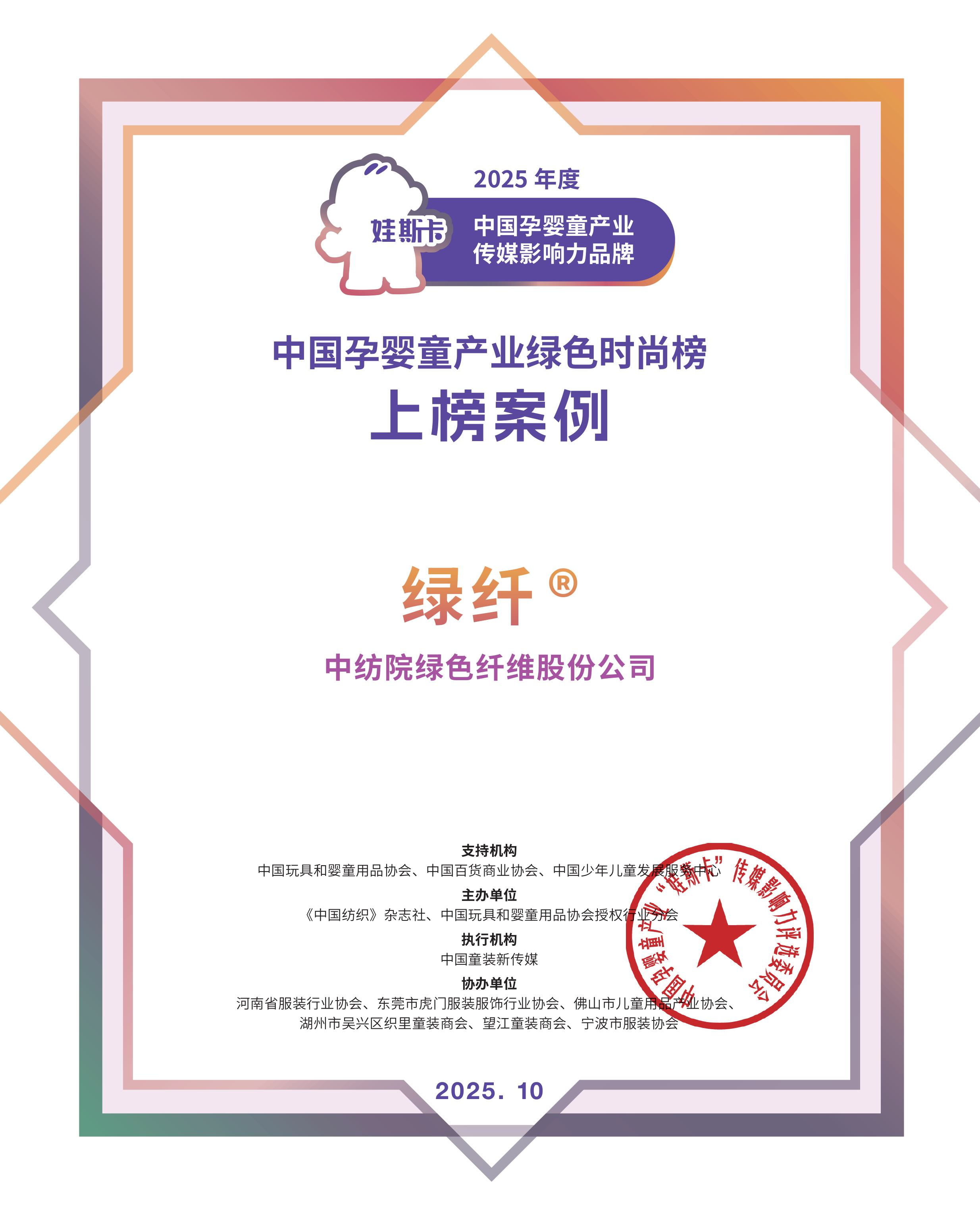 10月16日,2025中国孕婴童产业发展大会在上海新国际博览中心召开,会议以“童话无界 多元创联”为主题,全景呈现孕婴童产业跨界融合与创新实践。通用技术新材中纺绿纤凭借其在绿色环保纤维领域的重要贡献与创新价值,荣登“2025娃斯卡中国孕婴童产业绿色时尚榜”。